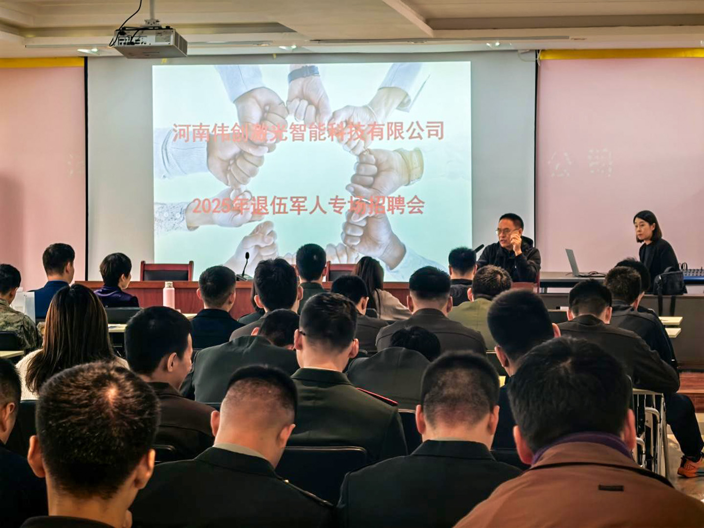 金秋十月,丹桂飘香。为深入贯彻落实国家关于做好退役军人服务保障工作的重要指示精神,扎实推动退役军人高质量充分就业,2025年10月15日,河南伟创激光智能科技有限公司与郏县退役军人事务局联合举办的“2025年度退役军人专场招聘会”在伟创激光公司五楼会议室成功举行。本次活动旨在为退役军人铺就转型发展之路,为企业输送优秀人才,为地方经济社会发展注入新动能。